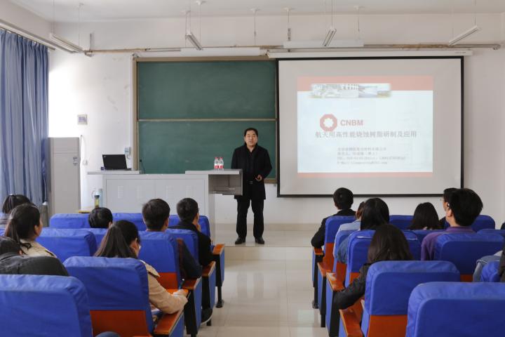 3月30日,应黄色小说 黄色小说 邀请,北京玻璃钢研究院复合材料有限公司科技处处长兼技术中心主任田谋锋高级工程师来黄色小说 做了题为“航天用高性能烧蚀树脂研制及应用”的学术报告,吴诗德副院长主持此次报告会,科技处周立明副处长与我院相关专业老师和全体研究生参加了此次报告会。