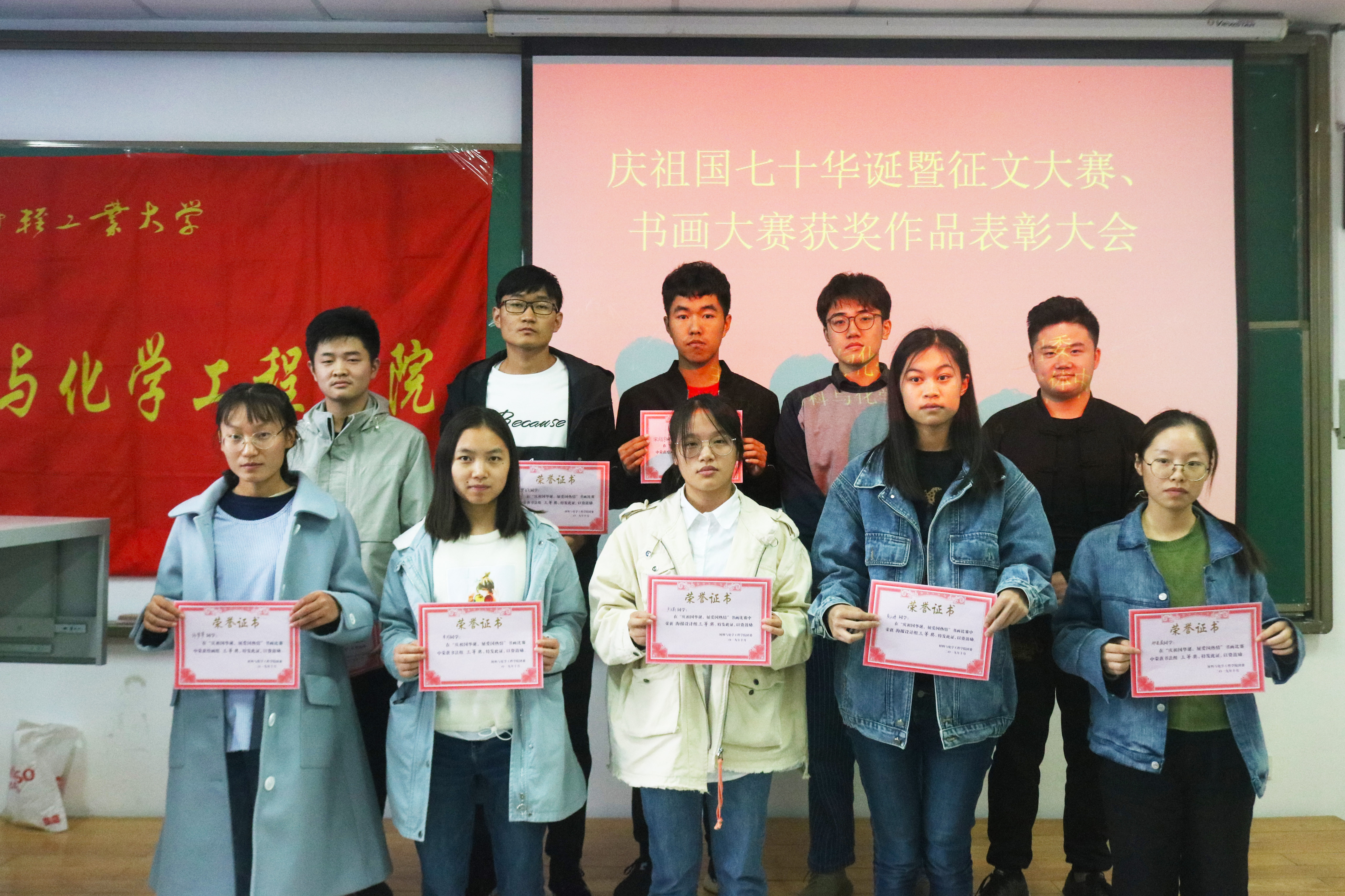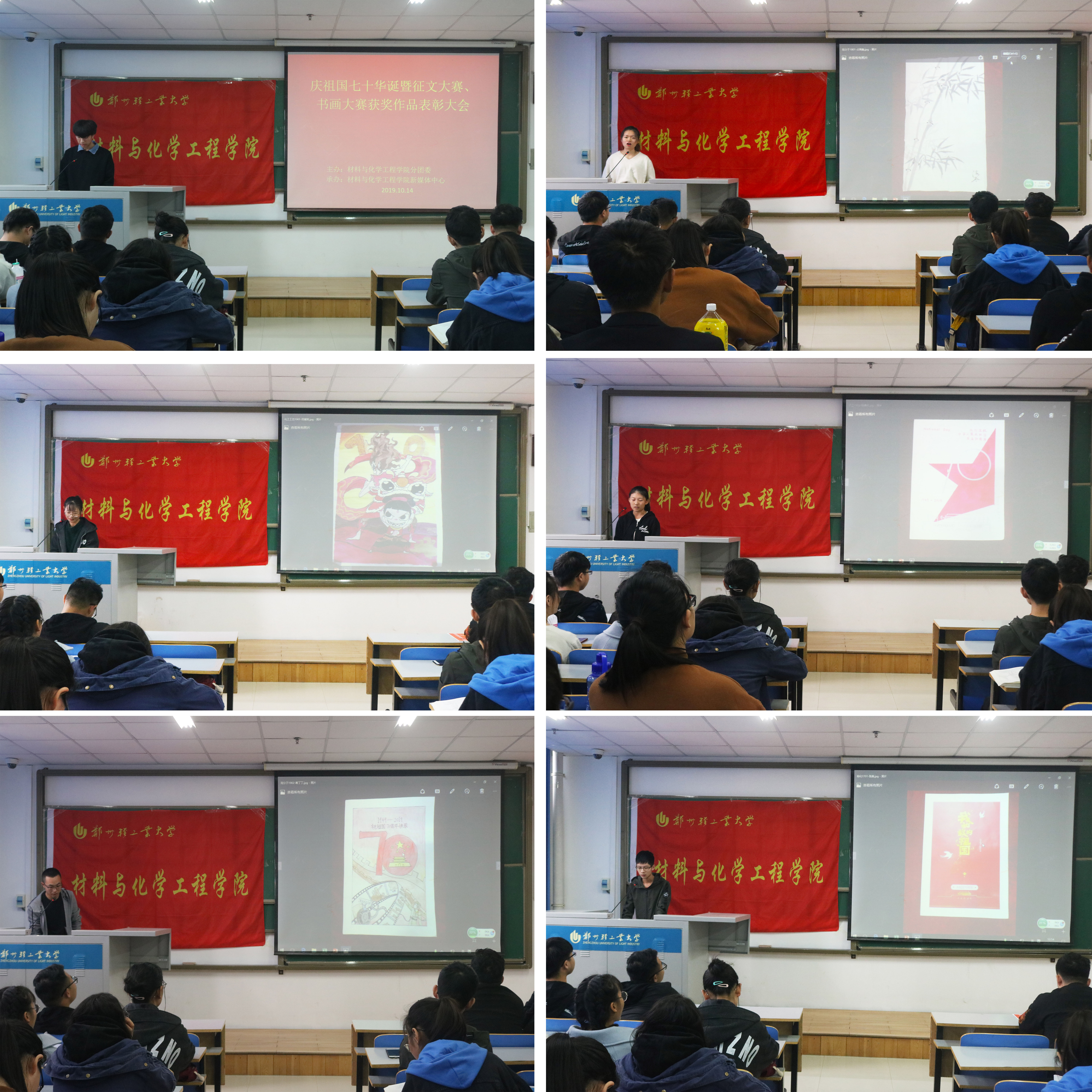 此次表彰大会以征文优秀段落选读、书画作品展示和作品理念解读的形式开展,经过前期宣传动员,各班同学自主报名,踊跃参加,征集征文80余篇、书画作品70余幅。经院系层层筛选,征文、书画一等奖3名、二等奖5名、三等奖10名。本次征文书画大赛作品内容以庆祝新中国70华诞为主,赞扬新中国成立70周年以来中国的新变化,新成就,新风貌,展示出中国人民蓬勃向上、开拓进取的精神风貌。其中精细化工1701班鄢宁在征文作品《我和我的祖国》中抒发了对祖国历经70年的风雨兼程取得举世瞩目的成就的感叹;征文《壮阔七十载,奋进新时代》从当代青年的初心使命出发,将个人梦与中国梦相结合,写出了当代青年勇于开拓,立志成才的坚定信念;海报作品《新中国七十载》以电影胶卷元素为依托,描绘了祖国70年来举办的大型阅兵仪式,一个个阅兵的细节中见证着祖国的强大,人民的自豪。