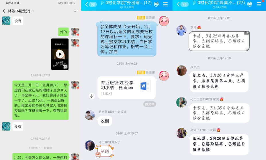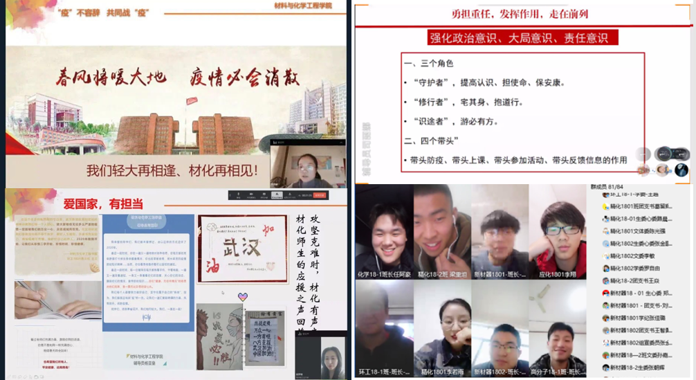 第二堂课 责任担当。学院分层次、分阶段多次召开辅导员、班主任、学生干部视频会议,号召学生干部、党员以不同的形式参与疫情防控工作,参与家乡防控一线,防控知识宣传,网络学习线上学业指导,班级困难学生学习监督,把疫情防控的责任放在了每一位党员干部的肩上,强化大学生的责任担当意识。