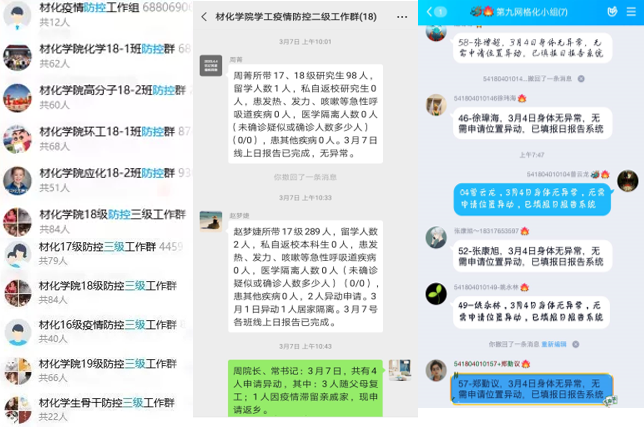 第三堂课 科学防控。利用自身专业优势,及时发布酒精、含氯消毒剂等消毒用品使用方法,介绍口罩佩戴、“六步”洗手等注意事项,引导学生尊崇科学、相信科学、自主运用科学知识;对重点关注学生群体,分类管理、指导,实施专项负责老师、辅导员、学生干部三级跟踪体系,推动各项工作科学、有序开展。