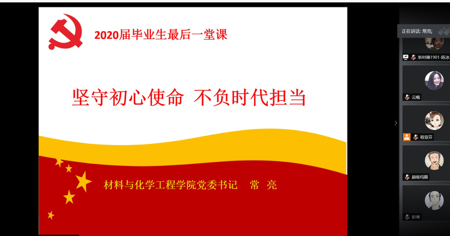 学院党委书记常亮以“坚守初心使命 不负时代担当”为主题,为毕业生党员讲授了最后一次党课。常书记对学生即将顺利完成学业、走上新的人生旅途表示热烈祝贺。她用详实的数字和鲜活的事例,讲解了“疫情下的中国力量”,以材化学院学生党员一线抗疫故事,生动阐述了学生党员“疫情下的责任担当”。常书记寄语毕业生党员,一要养成终身学习的习惯,向书本学习、向实践学习、向身边人学习,将学习精神融入生活工作的点滴之中;二要保持敬畏之心,不忘初心使命,永葆共产党员的先进性,在未来工作学习中认真做好本职工作,发挥先锋模范作用;三要把廉洁作为一种信念、一种追求,把廉洁的操守带到今后的工作中,树立正确的职业观,不断提升党性修养,以实际行动做社会主义合格建设者和接班人。