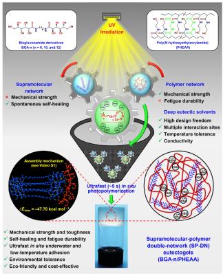 本研究通过将非共价自组装的超分子网络引入到共价交联的聚合物网络中,成功开发了一种新的基于小分子的超分子-聚合物双网络(SP-DN)低共熔凝胶平台。这种新的凝胶材料体系表现出优异性能:高拉伸性和韧性(> 18000%平面应变)、高自愈能力、超快速(~5秒)原位水下和低温(–80 °C)粘附性、优异的耐沸水、强碱、强酸(甚至王水)性能、耐超低温(–196 °C液氮)和高温(200 °C)性能,而且可用于水下文物的原址修复及宽温域柔性准固态电解质。该工作为制造具有高环境适应性的下一代软电子设备的机械坚固和功能集成的智能材料提供了一种有前途的设计策略。