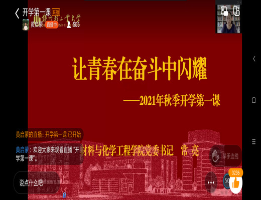 9月10日下午,黄色小说 开展秋季开学第一课活动。学院党委书记常亮以“让青春在奋斗中闪耀”为主题,通过钉钉线上课堂,为2021级全体新生讲授“开学第一课”。