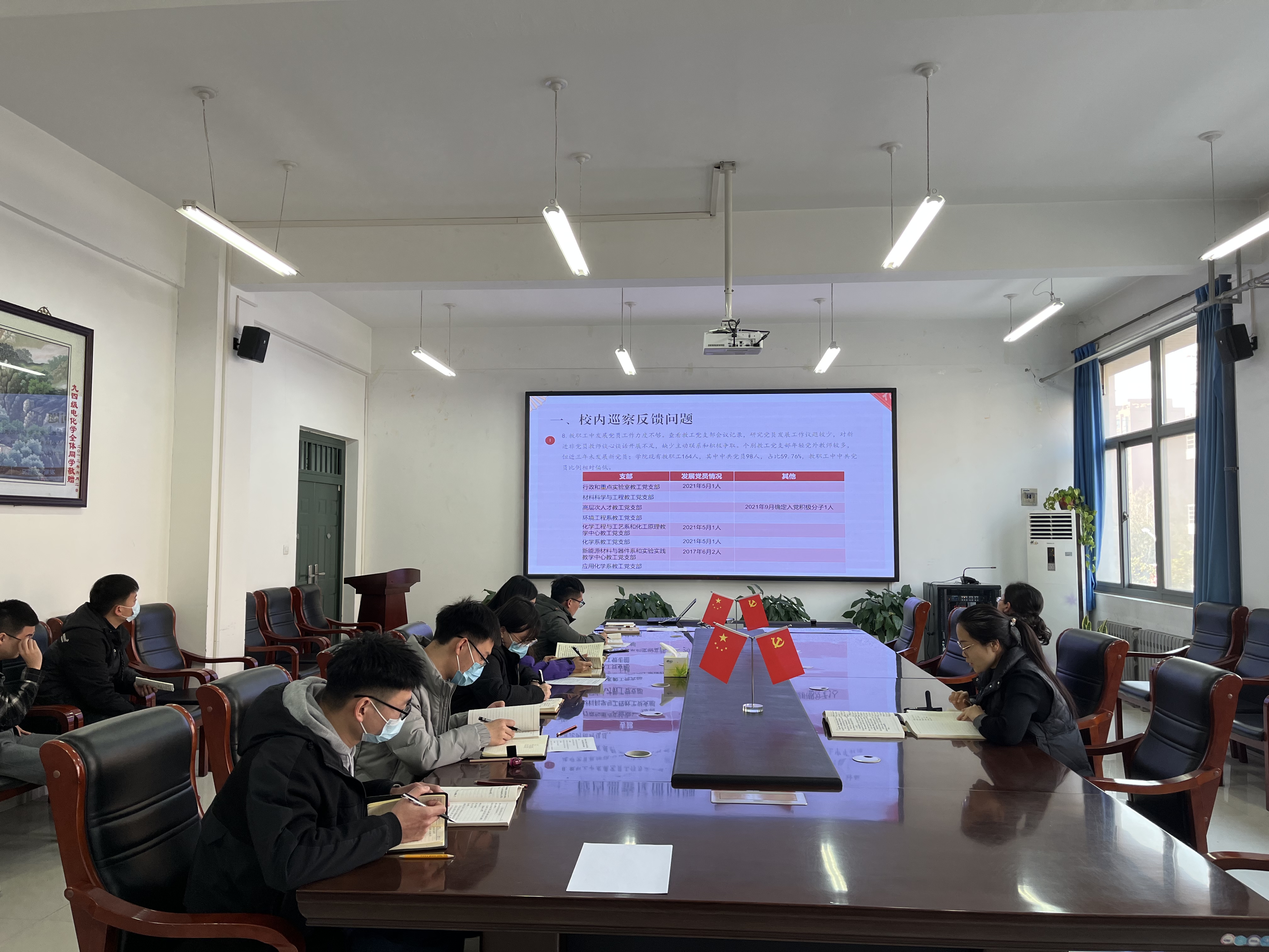 会上,司书记通报了校党委第二巡察工作组对学院巡察的整体情况,梳理了巡察过程中发现的问题,说明了2022年党支部工作要点。常书记就巡察组反馈的问题进行了详细分析,着重说明了推进落实巡察整改工作的重点难点和突破点,并对下一阶段巡察整改工作和任务进行了安排布置。各党支部书记就如何做好支部会议记录、开展志愿活动、强化“一支部一特色”等建设工作进行交流讨论。
