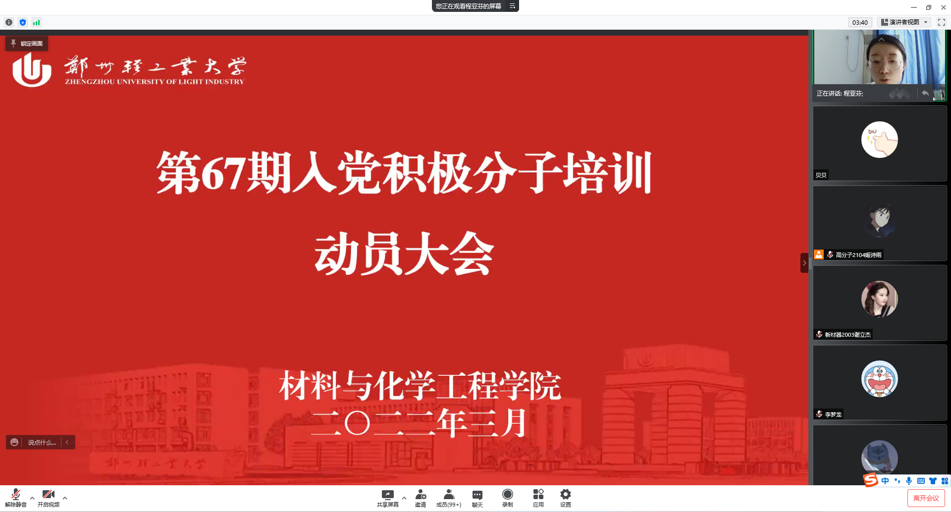 通过线上召开第67期入党积极分子党课培训动员会,负责党务工作的程亚芬老师、全体67期入党积极分子参加了本次动员会议。