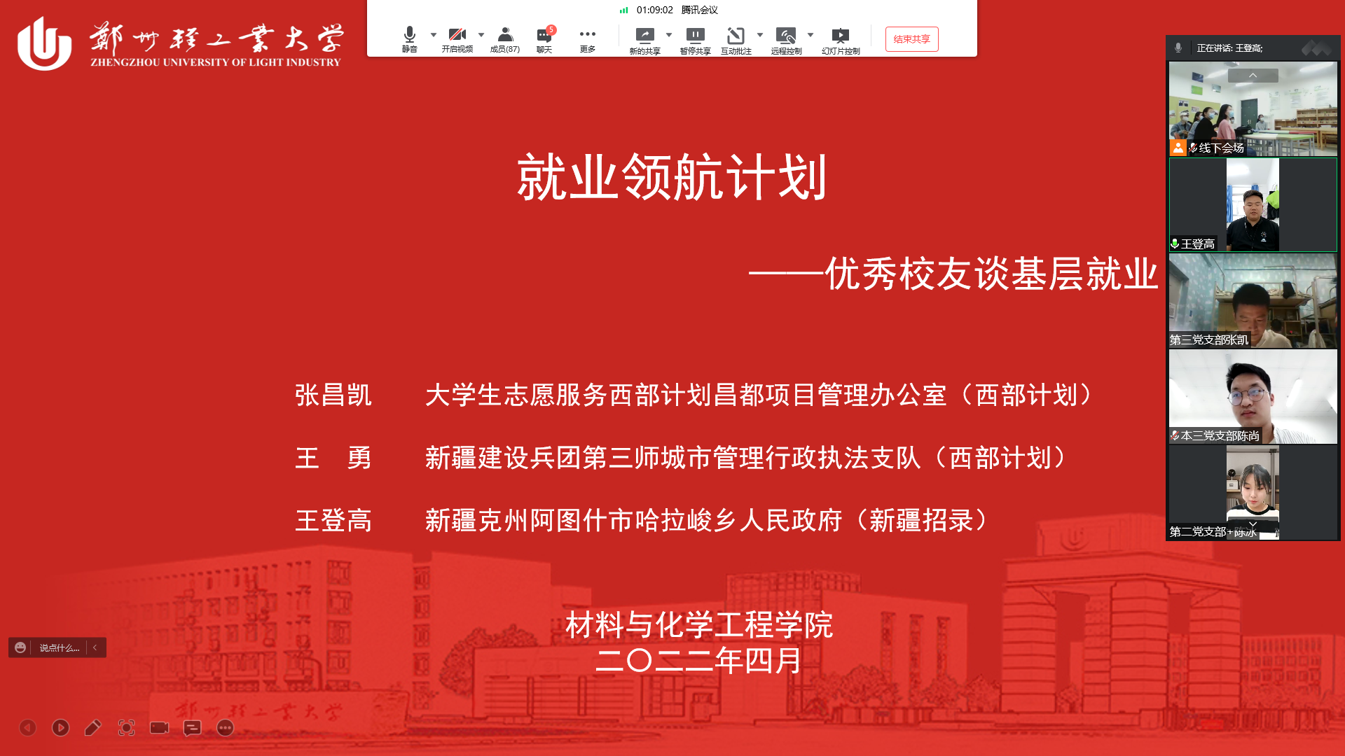 4月21日晚上,黄色小说 举办了基层就业交流分享会,会议邀请了近几年基层就业的优秀校友王登高、张昌凯、王勇在线分享在基层、在西部的收获与成长。院党委副书记司丽娜、就业专职老师刘贝贝、有意愿参加基层就业的毕业生及大三部分学生参加了会议。会议由刘贝贝老师主持。