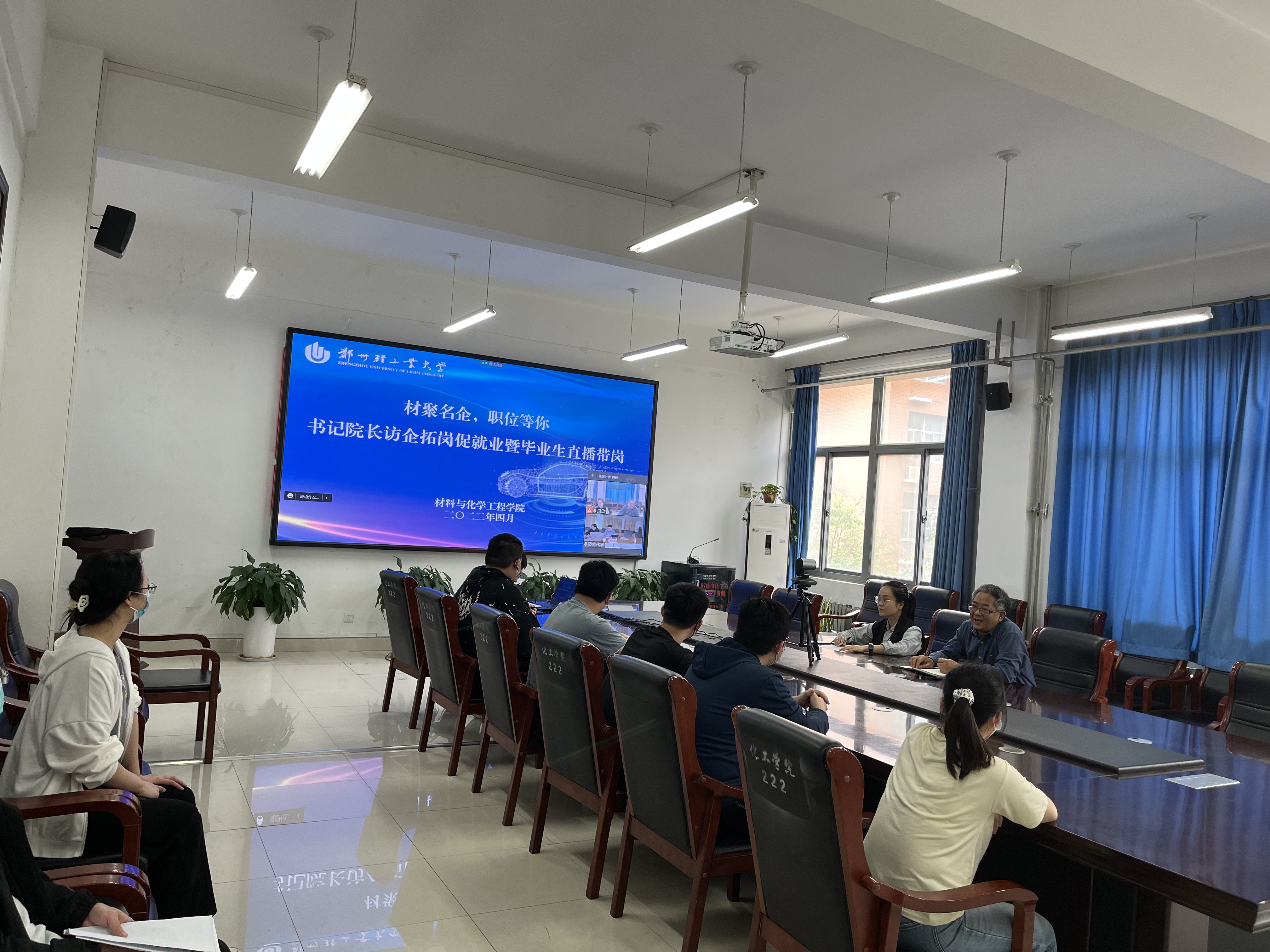 4月22日下午,黄色小说 通过线上线下结合方式开展“材聚名企,职等你来”书记院长访企拓岗促就业暨毕业生直播带岗活动。学院院长周立明、党委副书记司丽娜以及2022届全体未就业学生参加。活动由党委副书记司丽娜主持。