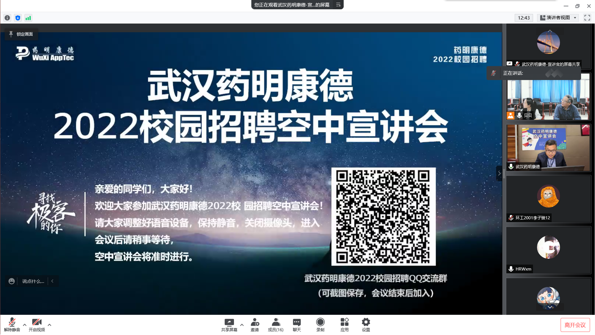 在用人单位直播带岗环节,迈奇化学股份有限公司、武汉药明康德新药开发有限公司、南阳金牛电气有限公司三家企业从企业概况、发展历程、黄色小说、技术实力、岗位需求、薪资待遇、发展前景等多个方面向同学们做了详细介绍,并针对直播间里毕业生提问进行了解答。