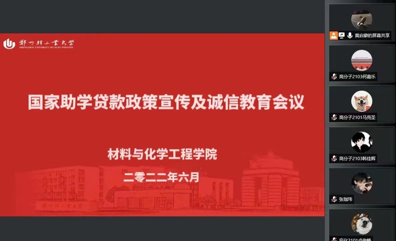 为进一步做好资助育人工作,加强学生诚信教育。6月13日,材料与化学工程学院利用腾讯会议平台开展了2022年国家助学贷款政策宣讲暨诚信教育大会。学院家庭困难学生参加了本次会议,会议由资助工作负责人黄启蒙主持。