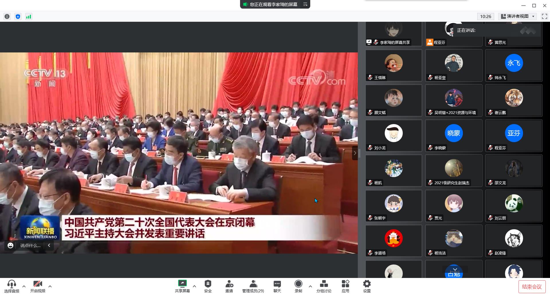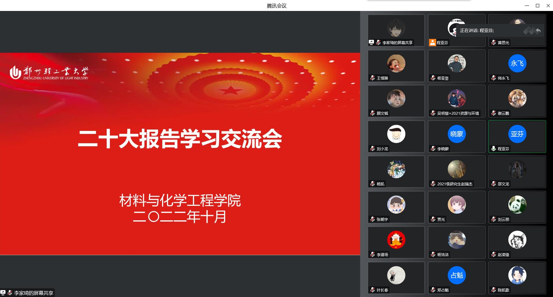 会上,程老师带领同学们观看党的二十大闭幕会相关内容,大家结合自己的学习、工作实际谈学习感受,一致认为习近平总书记的报告高瞻远瞩,举旗定向,思想深邃,气势恢宏,凝聚力量,催人奋进。作为新时代青年,必须深刻领悟,从伟大成就中感悟伟大精神力量,在广阔舞台上敢作为、敢担当,锻造过硬本领,开拓更加光明的未来。最后,司书记结合党的二十大精神学习和当前疫情形势,对同学们提出三点要求:一是认真学习、深刻领会报告精神,用党的最新理论成果武装头脑,提高个人理论知识,补足精神之钙;二是在疫情大考之时,将个人的小我融入进学校和社会的大我之中,继续认真落实学校安全稳定和疫情防控工作的部署,扛稳扛牢政治责任;三是踏踏实实学好专业课知识,在自己的领域不断进步,练就过硬本领,锤炼坚毅品格,为实现中华民族伟大复兴的中国梦注入青春力量。