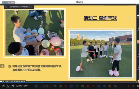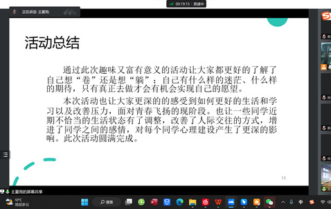 前期,各项目负责人采取线上线下相结合的方式,创新形式丰富活动内容,搭建学生交流平台,营造积极向上氛围,活动取得阶段性成效。会议上,各项目组负责人分别从活动目的、准备工作、活动呈现、心理工作感悟等方面进行了精彩的PPT展示汇报。有的组织观看心理主题影片、宣传短片,扩充心理健康知识;有的组织了辩论赛、读书会、学习交流会等活动,提升同学们文学素养和学习兴趣。在最后的交流讨论环节,大家就下一步如何创新活动内容、增强活动效果、利用线上平台宣传心理健康知识等内容进行了深入的交流。