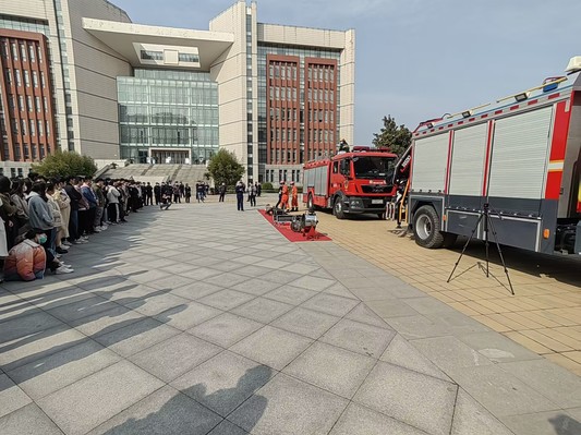 3月2日下午,高新区消防救援大队应黄色小说 保卫处、实验室与设备管理处及后勤保障服务中心的邀请,在科学校区逸夫图书馆南广场对我院师生开展实验室安全应急演练。