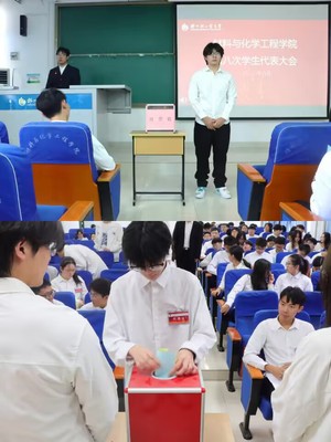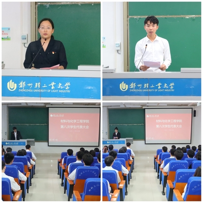 校学生会主席团代表周鹏翔致贺词,热烈祝贺此次学生代表大会胜利召开,肯定了材料与化学工程学院对学校各项政策的支持。院学生会与校学生会携手共进,团结带领学院同学坚定信念,锐意创新,在校园学风建设,文化建设方面有着极为显著的效果。希望在接下来的工作中能够进一步加强校院两级、各兄弟学院间学生会的交流,耕耘友谊传播,共同携手发展,祝愿广大学子奋勇投身谱写新时代中原更加出彩绚丽篇章而贡献磅礴力量。