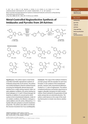 该论文被国际著名的化学评论期刊SYNFACTS杂志评为亮点文章(Synfacts 2024; 20(02): 0129,DOI: 10.1055/s-0043-1773007),认为该研究工作以2H-氮杂丙烯啶为底物,实现了金属催化剂控制的可切换化学选择性合成咪唑和吡咯衍生物的方法。在钯催化条件下,2H-氮杂丙烯啶经历C-C和C-N键断裂,再与第二分子的2H-氮杂丙烯啶环化形成三取代咪唑化合物。在银催化条件下,1,4-二酮化合物与2H-氮杂丙烯啶发生自由基加成反应,再经历1,3-H迁移、环化制备出多取代吡咯衍生物。此方法为快速选择性构建咪唑和吡咯衍生物提供了新的方法。
