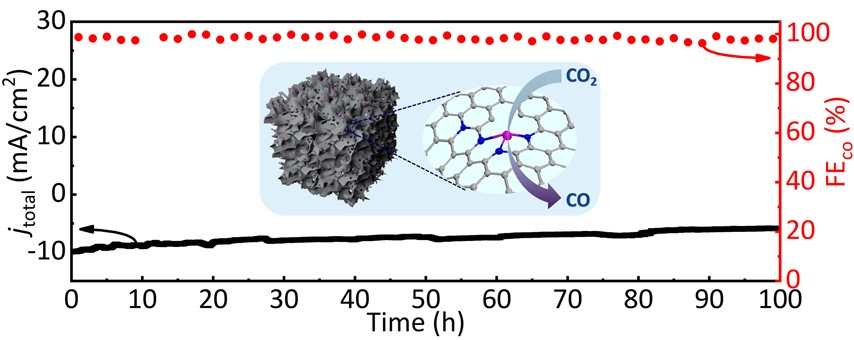 进一步地,团队以壳聚糖作为碳源和外限域层,以g-C3N4作为自牺牲模板和内层,两者间相互作用可有效抑制热解制备和反应过程中Ni单原子的迁移团聚,表现出优异的电还原CO2反应选择性和稳定性,产物CO法拉第效率在-0.55 ~ -0.95 V vs. RHE宽的电压范围内均保持在90%以上,最高可达99.6%;且连续电解超过100 h后,CO法拉第效率仍能保持在95%以上。该项工作发表在Small。论文链接://doi.org/10.1002/smll.202309014。