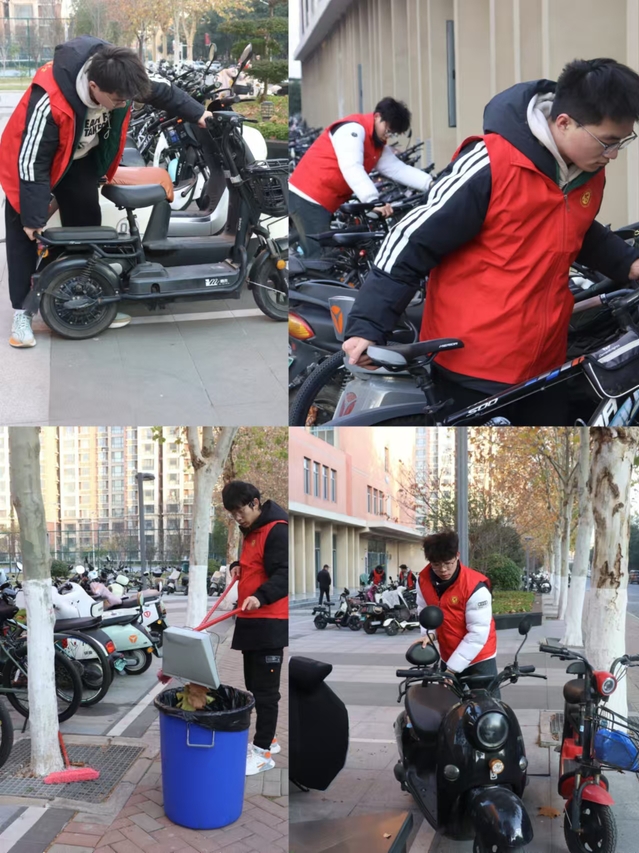 活动中,志愿者们身穿统一的志愿者服装,手持扫帚、垃圾袋等清洁工具,集合在9号楼前,准备对区域内的落叶进行集中清理。在负责人的有序组织下,有的挥动扫帚清扫落叶,有的弯腰捡拾垃圾,还有的负责将垃圾集中处理。经过一番忙碌,宿舍楼前的道路变得干净整洁,恢复了往日的明亮与整洁。此外,志愿者们还注意到了校园内电动车违规停放的问题,他们逐一将违规停放的电动车移到指定位置,确保电动车摆放整齐有序,既美观又方便师生出行。