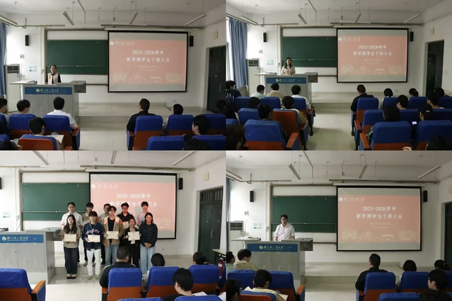 随后,学院对上学期工作突出的优秀学生干部进行了表彰,学生干部代表进行了发言,表示一定会传承学院优良传统,以最大的热情和最务实的工作,服务同学、助力成长,不辜负学校的培养和同学的信任。各专职辅导员分别就近期重点任务进行了详细安排,确保各项工作有序开展。