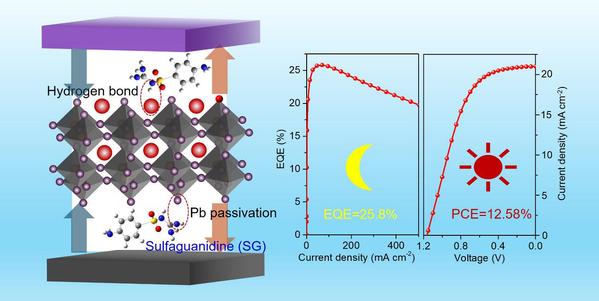 实现兼具光伏(PV)与发光二极管(LED)功能的双功能钙钛矿器件,关键在于精确调控晶粒结构以构建双载流子传输路径。本研究将磺胺胍(SG)分子引入钙钛矿溶液,重构了FAPbI₃薄膜的结晶动力学,进而形成垂直单层晶粒结构。其中,胍基(-NH-C(=NH)-NH2-)与磺酰胺基(-SO2-NH-)协同构建了连续的载流子通道:前者通过与Pb²⁺配位桥接相邻晶粒,后者则与FA⁺阳离子形成氢键。这种贯穿厚度的传输结构,在增强面外电荷传输的同时实现了双向功能,使载流子迁移率提升约一个数量级。最终,器件的外量子效率(EQE)从14.4%提高至25.8%,并创下1.10 V的超低开启电压纪录,在500 mA cm-2电流下EQE衰减低于20%,且光伏效率达到12.58%。本研究证明,贯穿厚度的传输结构工程是发展单片集成光电子系统的关键策略。