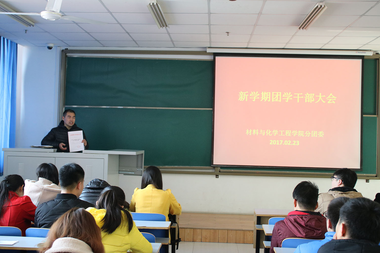 于2月23日下午在二教楼804室召开了新学期团学干部大会。分团委书记朱广正老师、分团委、学生会全体成员以及2014、2015、2016级全体班干部参加本次大会。