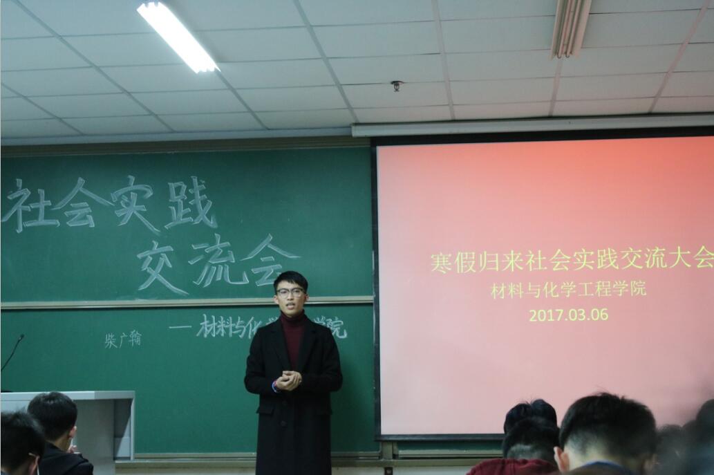 会议开始,主持人致辞引出寒假实践的目的以及对当代大学生成长、成才的重要意义,对学院2017年寒假社会实践的总体情况做了分析和总结并公布了优秀实践团队。“实践创新,发挥专业特长”——化学14-01班团队代表李一宝同学分享了社会实践的心得体会,他认为通过实地深入专业相关企业,他更清晰的了解了自己所学专业在企业生产中的实际应用,进一步认识了专业未来的发展潜力及工作环境,明确了自己努力的目标;“传承历史,感受中国文化”——高分子材料与工程14-01班团队代表贺玮同学分享了自己团队在寒假实地走访各种历史遗迹的经历,向同学们讲述了中华文明的发展,并通过寻访先辈足迹,使自己对传统文化有了深入理解;“聚焦十三五,共创绿色和谐”——环境工程15-01班团队代表贾泽臣同学向大家讲述了在家乡开展关注留守儿童活动的经历,让大学生了解并关注到留守儿童这个弱势群体;“道德新风,传播爱心服务”——应用化学15-01班团队代表冷本凯同学给大家分享了自己团队与一些孤寡老人交流的经历,向同学们讲述中华尊老的美好品德,并呼吁大家能够将此美德传承下去,共筑社会主义核心价值观。最后,各个优秀实践团队对同学们提出的问题做了一一解释,广大新生同学反应热烈。