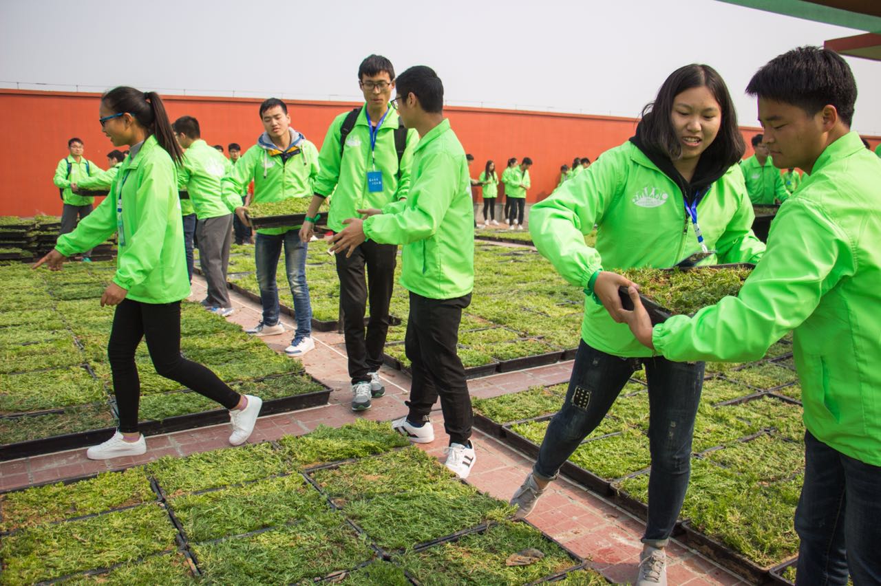 清晨六点半,迎着春风,四辆大巴载着材化学院的200余名志愿者踏上了生态环保行动的征途。在郑东新区的主会场,蓝天白云下是一队队身穿绿裳,朝气蓬勃的材化志愿者们正和工作人员一起布置会场。上午十点,经过了骑行、小型马拉松传递,河南电视台都市频道著名主持人韩佳和我们的志愿者团队一起护送着圣火来到了主会场参加火炬传递开幕式。共青团河南省委领导亲自接过火炬,与各个会场的志愿者代表同时点燃火炬。青少年立体植绿活动发起人王洋向广大青年提倡了保护绿色生态家园应立足实际,践行绿色生活,增大绿地面积;在治理、保护、植绿等多方面发起了倡议。并由韩佳宣布“绿风尚”河南青少年生态环保攻坚行动在郑州、平顶山、新乡等会场正式启动。材化学院的志愿者团队作为本会场的主力队伍更是迅速就位,大家一起铺绿植,撒绿意,小小绿植,满满希望。原本空荡荡的楼顶一点点变得生机盎然,这将是所有人心中最美的花园。